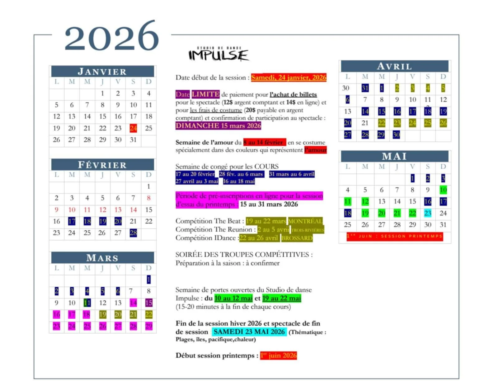 Toute l’équipe du studio de danse Impulse est bien heureuse de vous retrouver en personne. Suite à la pandémie mondiale, nous avons modifié et réadapté notre façon de travailler en ce qui concerne les communications. Bien que nous prenons les appels une fois par semaine ( en général le dimanche, peut varier durant les fêtes), nous priorisons maintenant la communication par courriel ainsi que via les réseaux sociaux. Alors, si vous désirez nous joindre, contactez-nous par courriel ou via la boîte de réception de la page Facebook Studio de danse Impulse. Nous contacterons par téléphone seulement s’il y a des urgences. Nous vous remercions sincèrement pour votre compréhension en rapport avec la situation. Nous serons de retour activement dès le 10 janvier 2026.